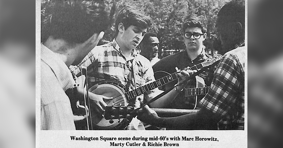 In New York City around 1960 (I was that 14 year-old), the opportunities to hear bluegrass were rare indeed. Only a few LP’s (and no singles) could be found in the racks in record stores, and perhaps one known group came to town in any year (Flatt and Scruggs, Reno and Smiley, Jim and Jesse, Bill Monroe). The people, who had started learning from their records a few years before I did were the pickers I heard most. On Sundays when the weather was good they would congregate in Washington Square Park in downtown Manhattan. There we would have a typical “parking lot” scene, picking, singing, and competing with one another until 6 pm, when friendly policemen would break in to enforce the local music curfew.