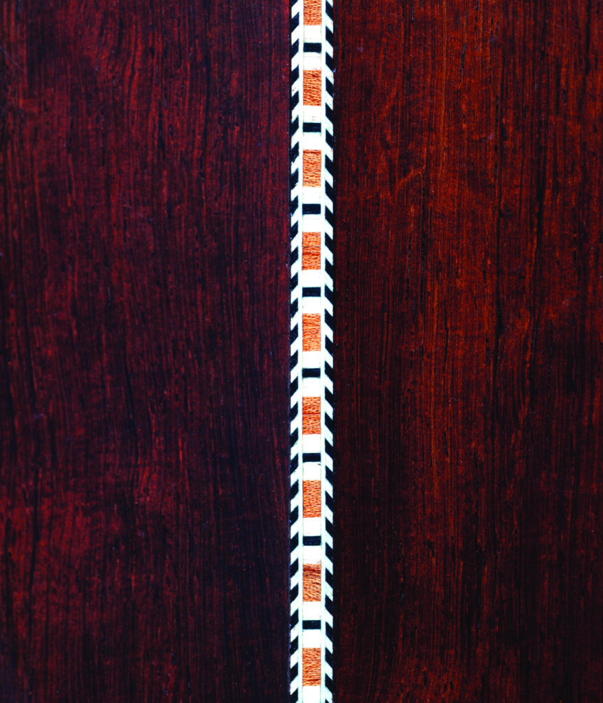 One intriguing note about this guitar is that Eastman did not feel compelled to recreate a D-28-style guitar down to its rigidly traditional appointments. That’s a sign that the company recognizes it is establishing a presence in the high-end acoustic guitar market and needs to set itself apart. So instead of white bone bridge pins with redeye dots like most D-28s, we find nicely crafted unslotted ebony pins with abalone dots seated in the ebony bridge. The herringbone top purfling eschews the rather dowdy black/white traditional chevron pattern, adding a third element of brown wood—maybe dyed mahogany—to create a subtle bit of arboreal bling. Likewise for the marquetry in the backstrip, where the same brown material is added to introduce a bit more color and individual style to the pattern. It’s a very nice look, but might take a bit of getting used to. It clearly shows how Eastman has absorbed the best elements of traditional American guitar design and then branched out to create a subtly unique aesthetic here.
