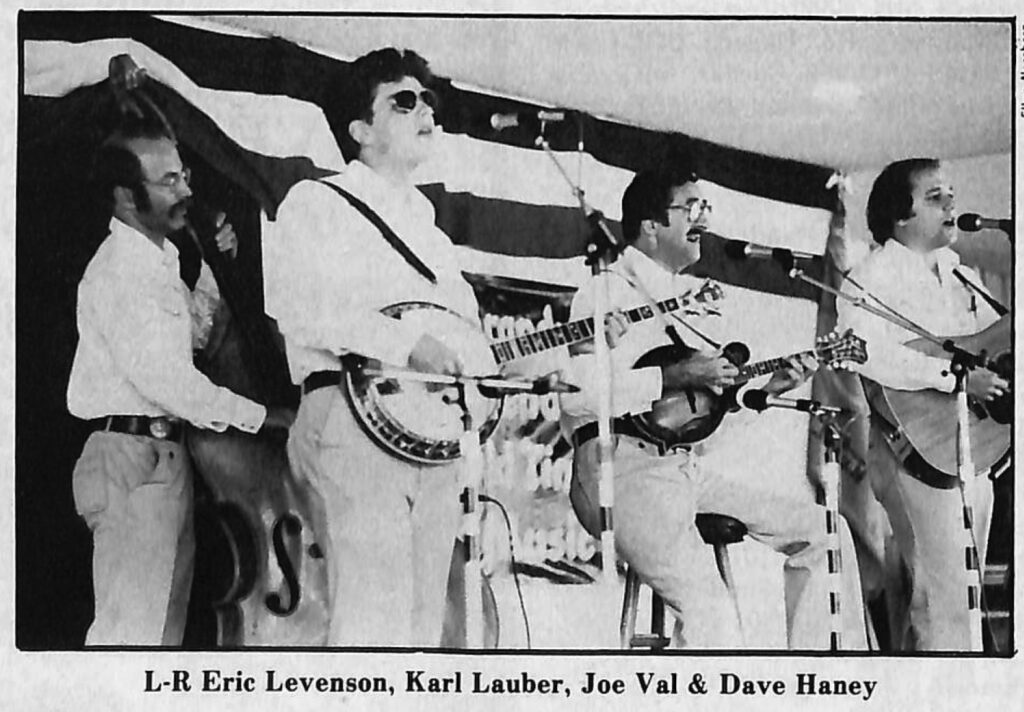Lauber was an excellent candidate to replace Silvius. In addition to being a competent and tasteful banjo picker, Lauber plays fiddle, guitar, and clawhammer banjo, talents which are gradually being worked into the New England Bluegrass Boys’ performances. Also, he essentially grew up on Val’s music. He is at home playing banjo with Val’s material and has always had an interest in singing baritone. He has worked at mastering the baritone styles of Sonny Osborne, Eddie Adcock, and Earl Scruggs, learning how to add color by varying the notes he adds to the trios. The present band includes Joe Val, Dave Haney, Karl Lauber, and Eric Levenson.