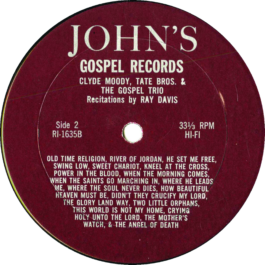 I just borrowed a copy of a release on John’s Gospel Records, RI-1635, 12” vinyl 33 1/3 RPM.  Side A appears to be the Stanley Brothers with the same song list as Wango 103, while Side B is Clyde Moody, the Tate Brothers & the Gospel Trio, along with recitations by Ray Davis.  There are no breaks between tracks on either side. I can’t find any reference to the label or the release number anywhere, so I’m hoping you can help out.  Thanks.