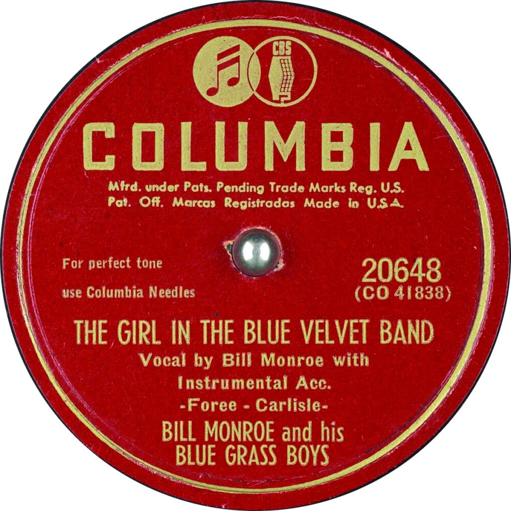 Neil Rosenberg and Charles Wolfe wrote in The Music of Bill Monroe that “The Girl in the Blue Velvet Band” had been “a huge hit in 1934 when Cliff Carlisle recorded it for the American Record Corporation. The grim, melodramatic story concerns a boy from San Francisco who meets a strange girl whose hair is tied in a blue velvet band. As they walk arm in arm, she slips a ‘diamond worth ten grand’ into his pocket and frames him for robbery. He is sent to San Quentin for ten years. The song was already widely known in folk traditions, with considerable variation, when Monroe recorded it.”