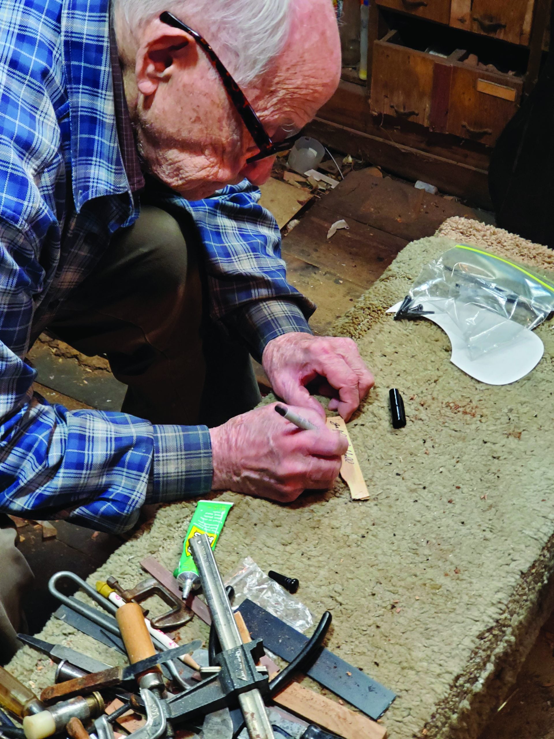 At an age when most people have slowed down, 99-year-old Buckeye luthier and instrument repairman Jeff Littell rises by 7:30 and is at his well-equipped, dimly lit basement workbench after breakfast most days. His days fill with repairing double-basses, fixing all manner of bluegrass instruments, and even building a C.F. Martin dreadnought kit for a local player, a routine that keeps him active and sharp as a Japanese wood chisel.