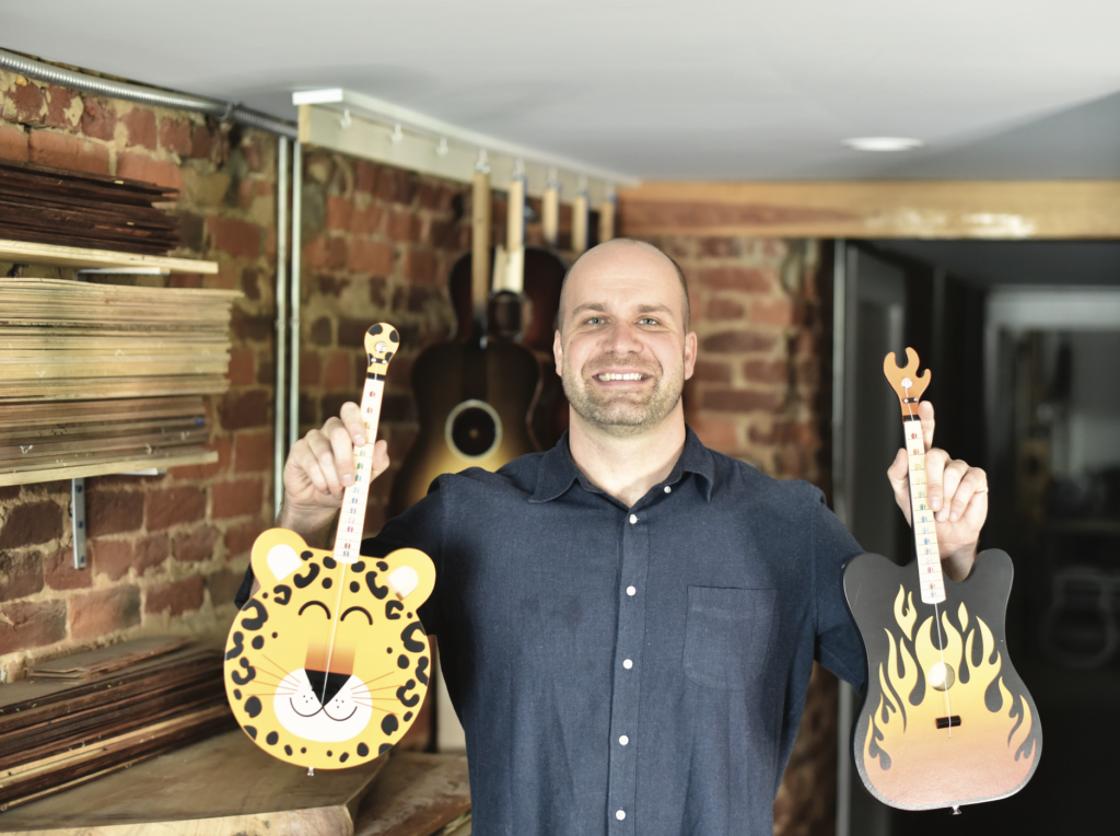 The first thing that Brian did was talk with guitar teachers who worked with children to find out why it was difficult to teach younger kids how to play the guitar. The answer was that it was too hard for them to form full chords and suggested they felt like the ukulele was a better place to start. Brain, who has had a life-long fondness for drawing animals in cartoon form, created a dinosaur-shaped ukulele and took it to a child’s fifth birthday party. He said, “The kids at the party lined up to play it. They would bang on it and strum the strings, but as soon as I tried to show them how to play a chord, they lost interest. When I tried to show them a simple melody, it was too much for them to try and deal with all of the strings. They didn’t have the dexterity and so they couldn’t get it.” That night, Brian thought about it and realized that if playing chords was too hard and playing melody on multiple strings was difficult, then why not present the child with a guitar that only had one string? That way they could think linearly, like playing on a piano keyboard.