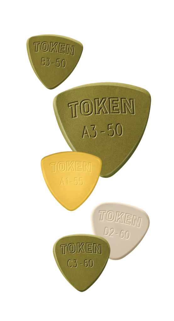 Currently, Token offers three different pick materials as discussed above. They also offer four different pick thicknesses—45, 50, 55, 60 (thousandths of an inch) and four varieties of pick shapes. The Amber (PEI) pick is $18, the Tan pick (PEEK) is $24, and the Green pick (PAI) is $28. Andy Falco loves the fact that Token offers three pick material choices. He said, “That is the cool part of Token. They have a few different materials. Using different materials is great for tone change or vibe change. I like to change the pick once in a while because it is inspiring to have a different feel and change things up a little bit. I also like to have different materials that produce different tones while I’m recording. In the studio, I have a whole kit of picks of various thicknesses and shapes, and materials, because sometimes just the right pick gives you that extra part of your color palette. I love that Token picks are made of various materials.”